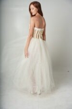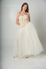 This playful dress created with feminine, elegance, flirtation in mind is the true vision of best of the worlds. The past using flowing floor length and the modern times with delicate creations in addition to hand embroidery bodice.