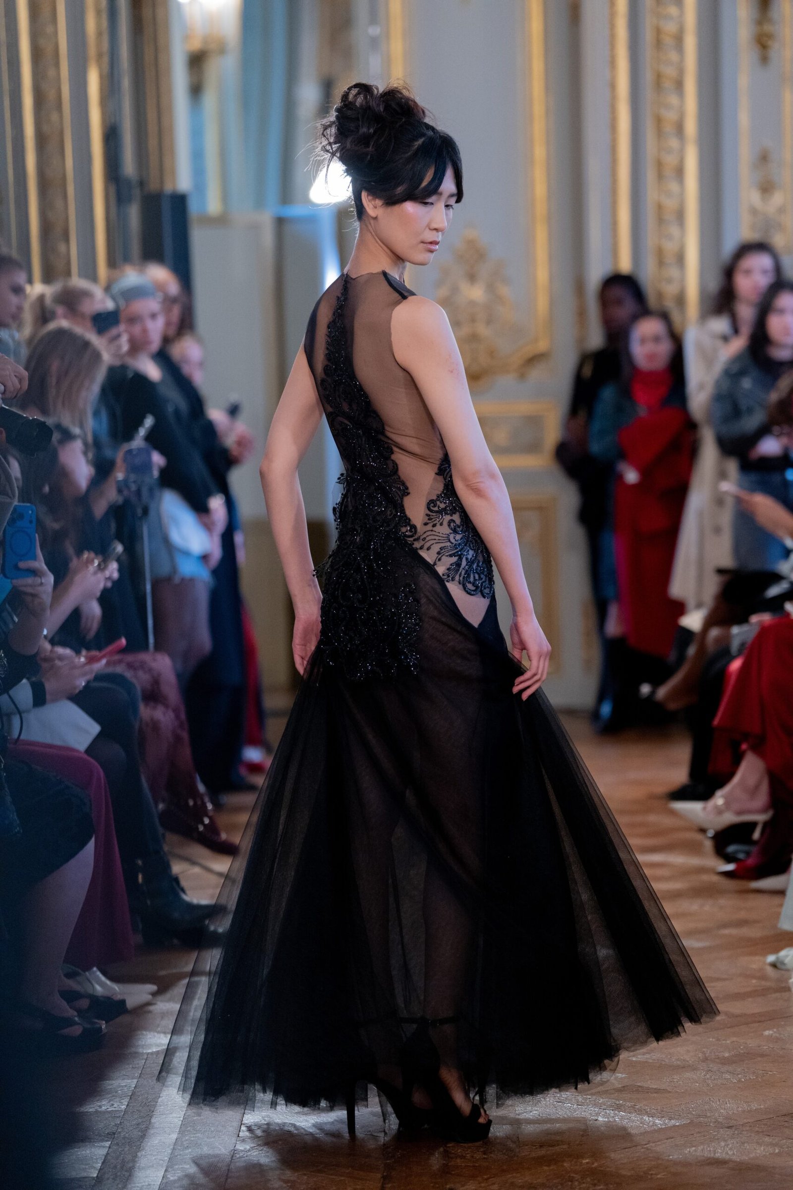 Midnight black is a bold, deductive statement piece designed to captivate. Featuring a sheer black silhouette, the dress is intricately detailed with delicate lace applique that artfully contours the body , creating a striking contrast between transparency and coverage. the halter neckline draws attention to the shoulders  and neckline, while the plunging illusion bodice enhances its dramatic, feminine appeal.