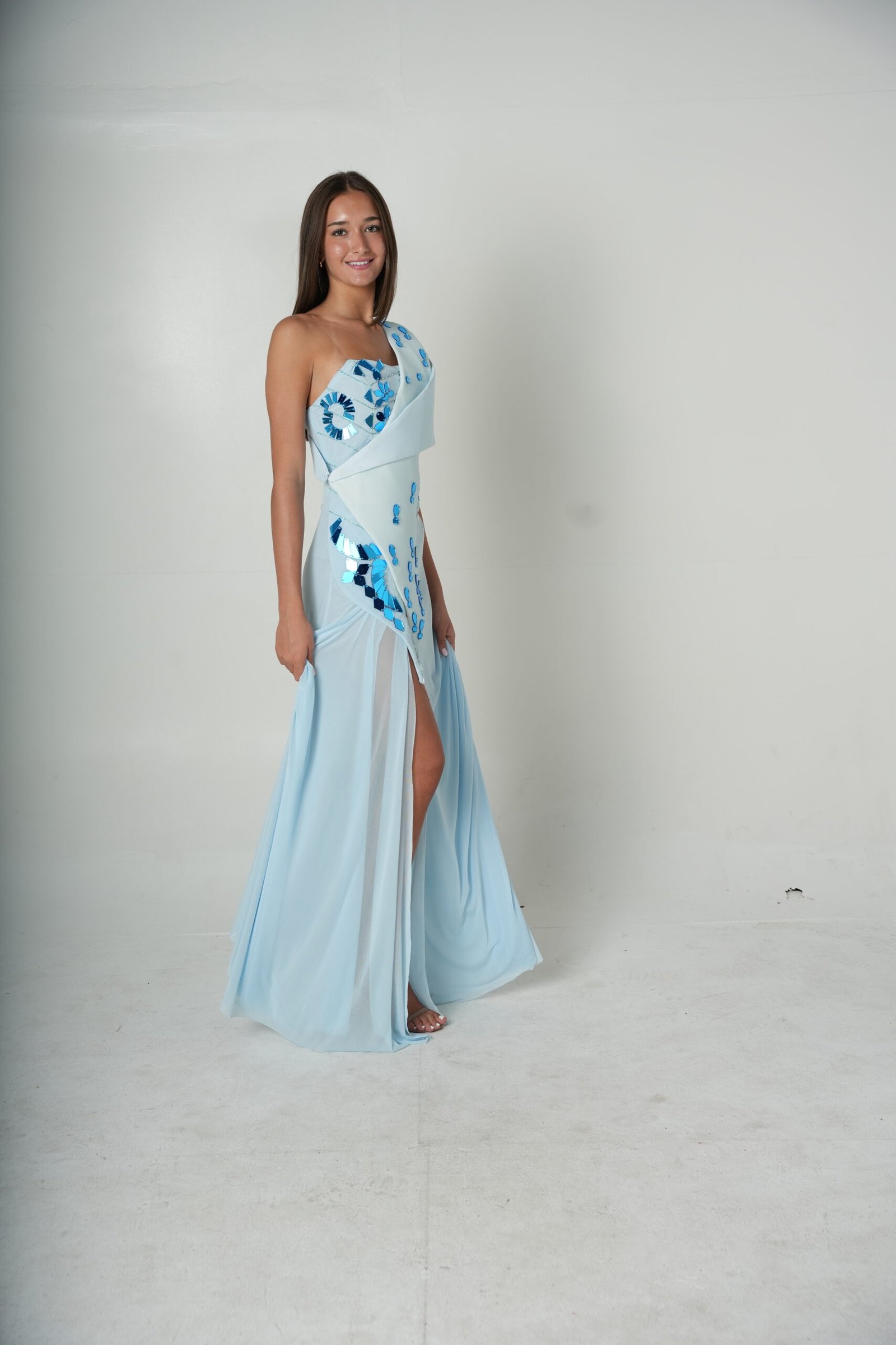 Soft, serene, flowy. Elegance throughout the dress and delicate mirror applique applied with a keen sense of beauty.