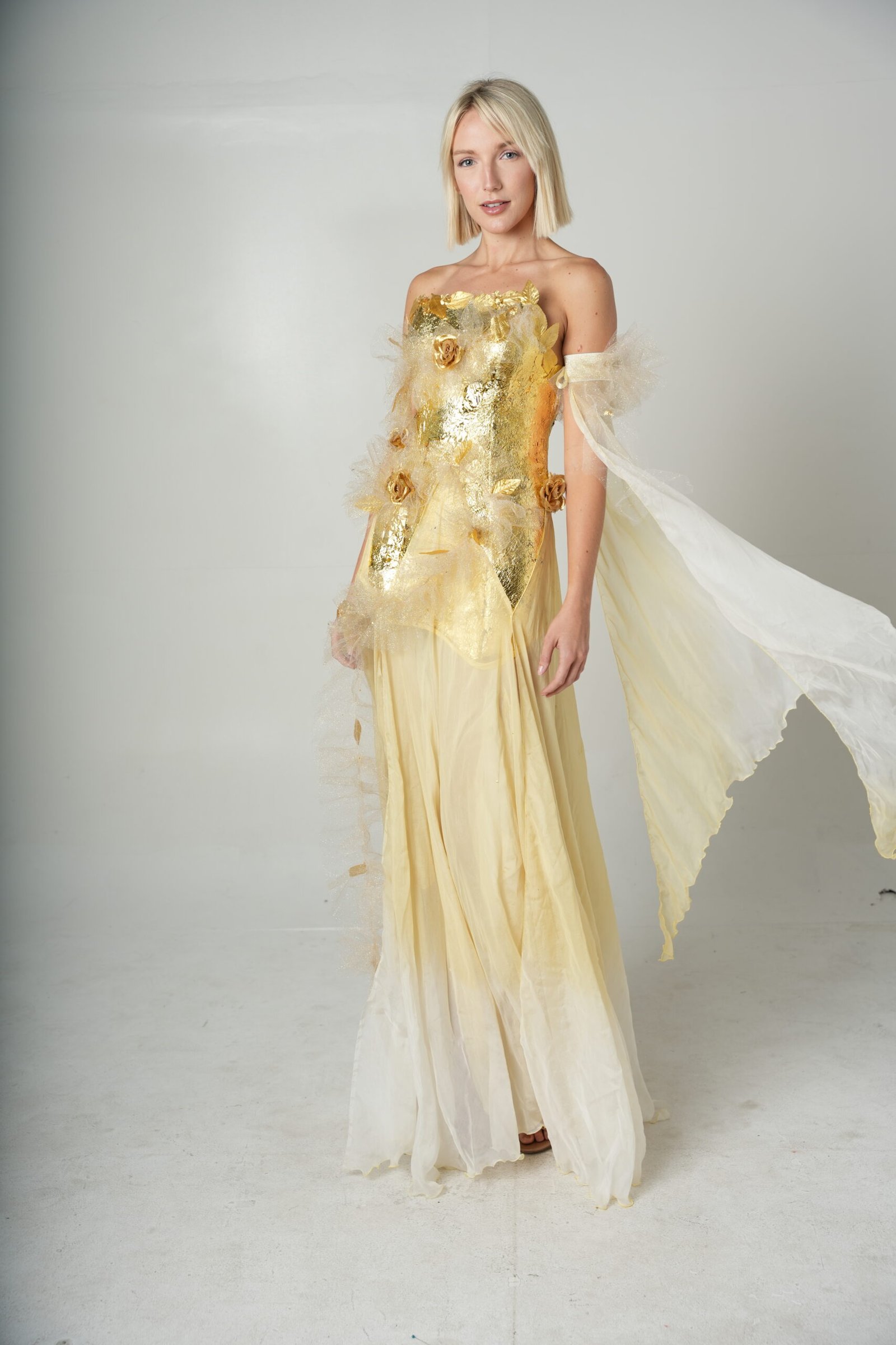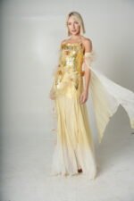This gown is an ethereal, statement making piece that blends elegance with artistic design. created from soft tulle flowing fabric,