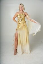 This playful dress created with feminine, elegance, flirtation in mind is the true vision of best of the worlds. The past using flowing floor length and the modern times with delicate creations in addition to hand embroidery bodice.