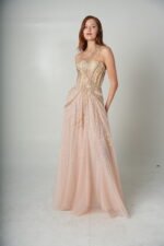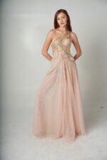 Floor length, flowy silk charmeuse with gems hand-placed through-out the bodice. Elegant and feminine. Note: All products are made to