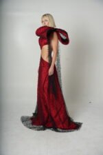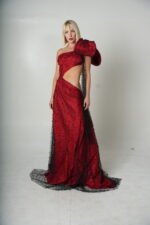 Striking, high-fashion evening gown with a bold, sculptural design. The dress deep burgundy silk and black net with black pearls and subtle sheen, gives a luxurious finish. One shoulder silhouette, where one side has a dramatic oversized bow that adds volume and couture flair. The asymmetrical cutout at the waist crates a modern, edgy shape that highlights the torso and adds visual interest.