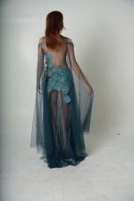 This gown is an ethereal, statement making piece that blends elegance with artistic design. created from soft tulle flowing fabric, the dress features a form-fitting silhouette with strategically placed hand-made crochet appliques that create a sculpted, body contouring effect. the soft teal tones give it a dreamy, ocean- inspired feel. Delicate yet bold, this piece is perfect for editorial shoots, red carpet moments , or special occasions where you want to make a truly unforgettable impression.